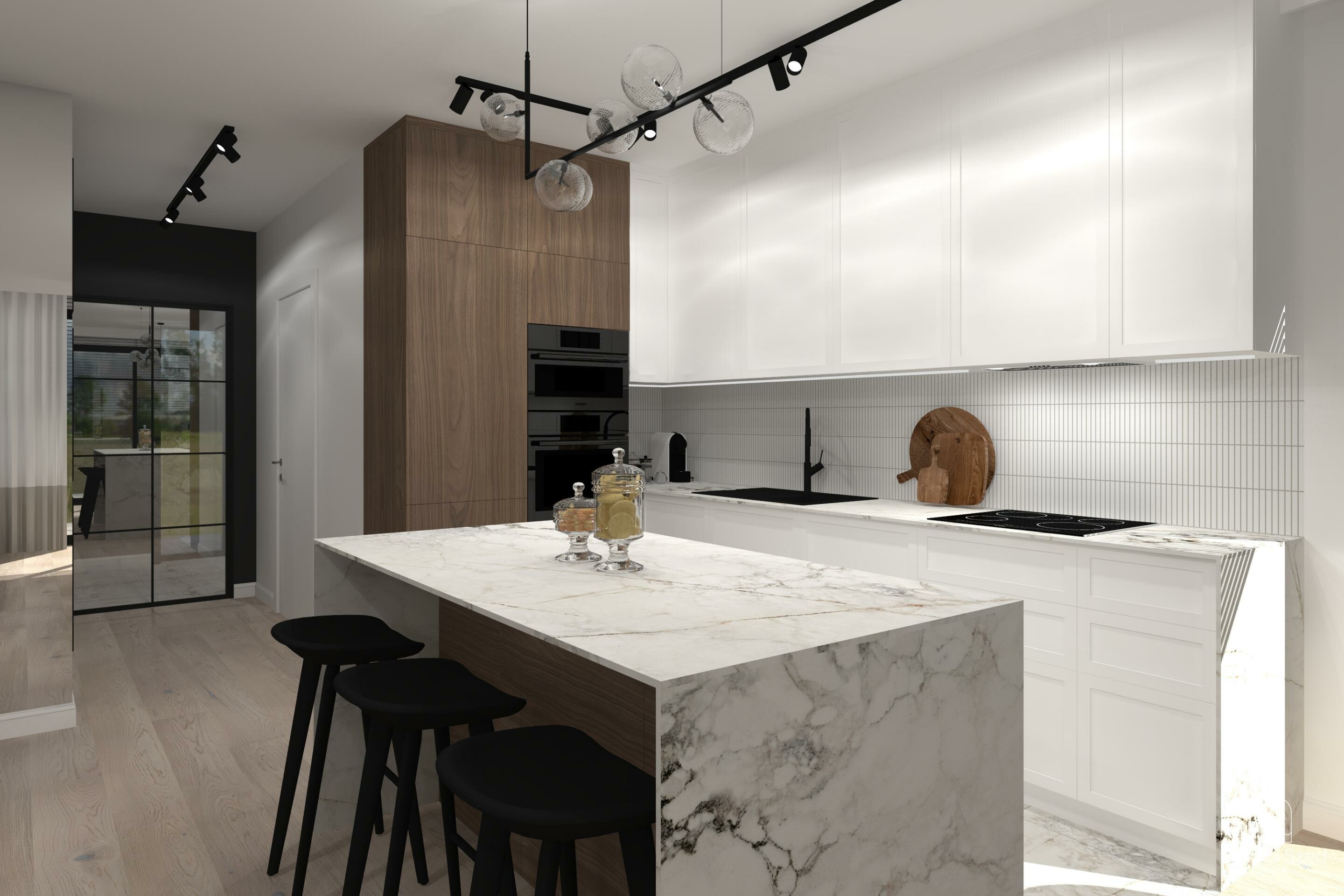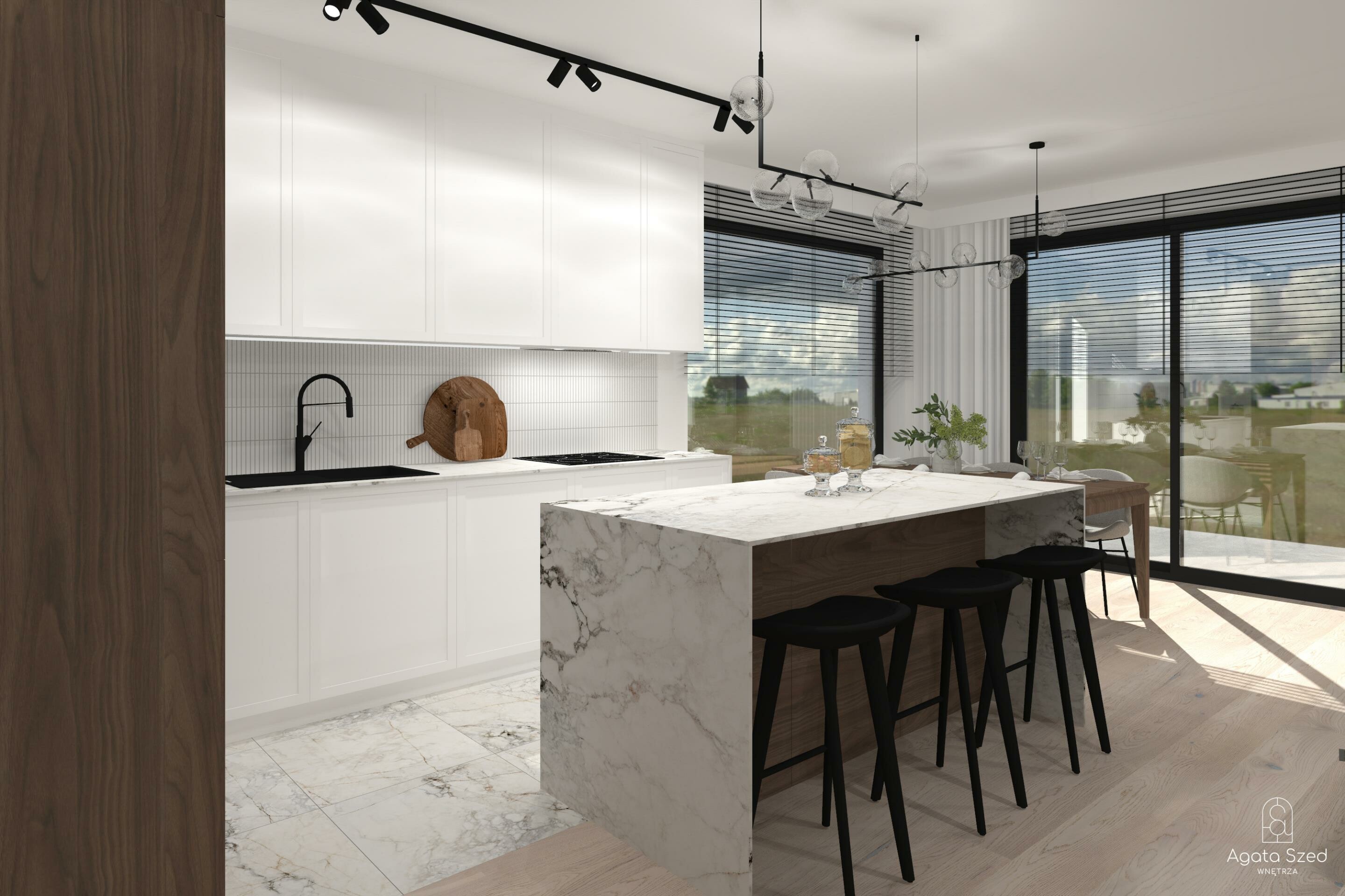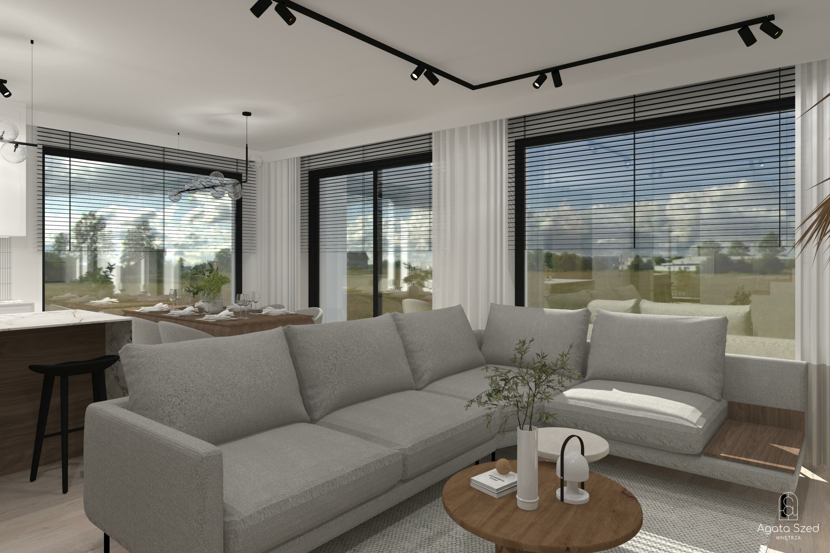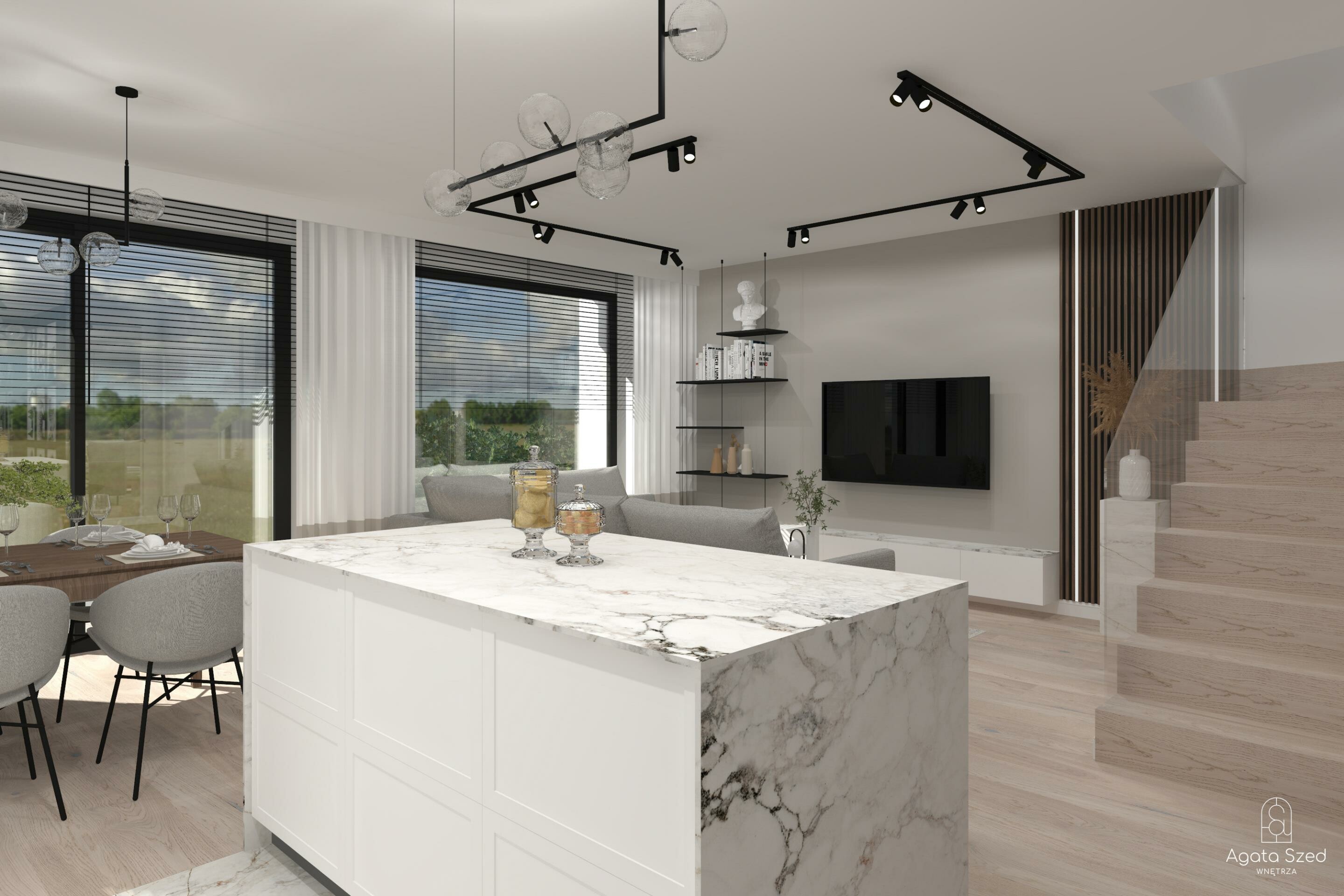 Nie zapominajmy również o przestronnym salonie i jadalni z wyjściem bezpośrednio na taras, a także o funkcjonalnej kuchni z miejscem na dodatkową spiżarnię pod schodami.
